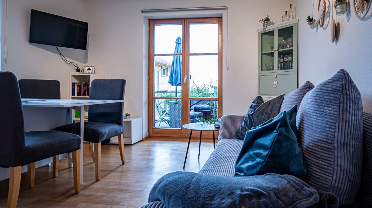 Die Ferienwohnung verfügt über einen umfangreich ausgestatteten Wohn-/Essbereich inklusive Küchenzeile und Schlafsofa, ein Schlafzimmer und ein Badezimmer mit separiertem WC.